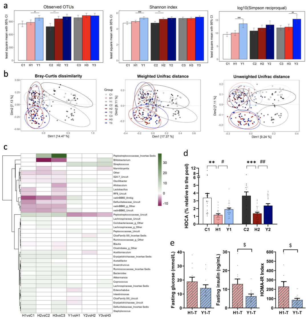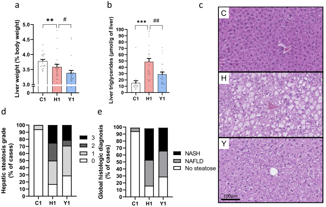 他们将酸奶以冻干形式添加到高脂高糖饲料中,替代了每日能量摄入量的7.6%。小鼠分为正常饮食对照(C)、高脂高糖饮食组(H)和添加冻干酸奶的高脂高糖饮食组(Y)。他们发现,与高脂高糖组相比,经过3个月后,添加冻干酸奶的高脂高糖饮食组小鼠总能量摄入降低,体重下降2.9%。