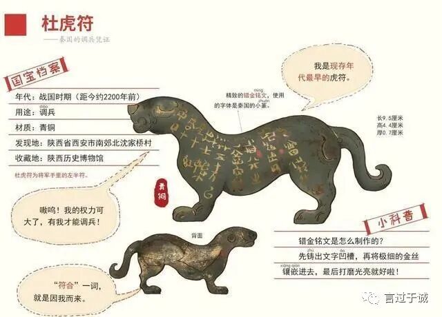 后来,经过鉴定,专家确定这块虎符是战国晚期秦国兵符,这是迄今为止发现最早的兵符实物。由于虎符发现处在陕西西安市东南方向,为秦国的杜县,专家因而将其命名为“杜虎符”。
