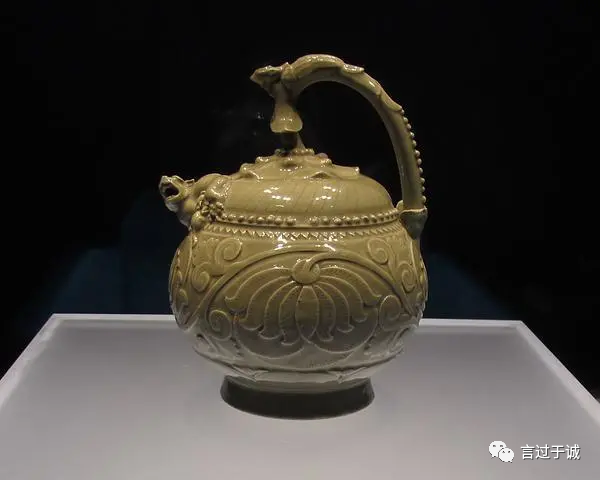 五代耀州窑青釉刻花提梁倒流壶造型新颖,构思独特,可谓集实用性和艺术性为一体,专家认为,此壶可称之为国宝级文物。