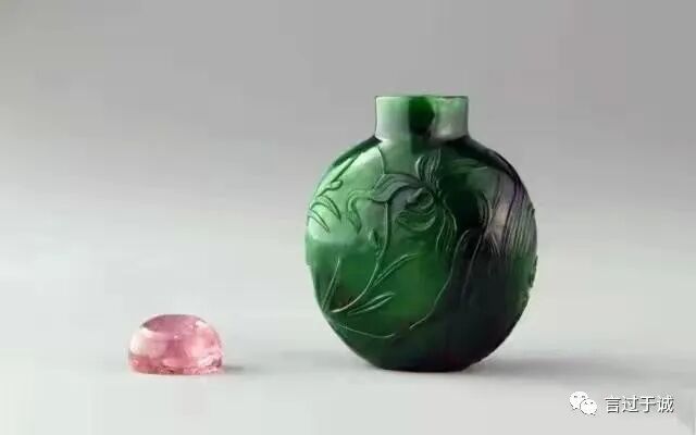 这是一个通体翠绿的小瓶子,小巧玲珑,周身雕刻着精美的花卉,栩栩如生。瓶口有一个粉色椭圆形的盖子,状若珠宝,绿、粉两种风格迥异的色彩搭配在一起,竟出奇的和谐。
