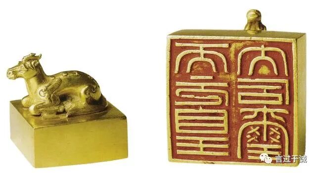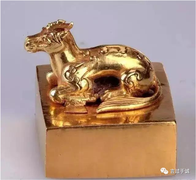 金印的钮为獬豸钮,传说獬豸能辨曲直,发现奸邪之人,就用角把他触倒,如今法院门口多放獬豸,是因为獬豸象征着勇猛、公正。