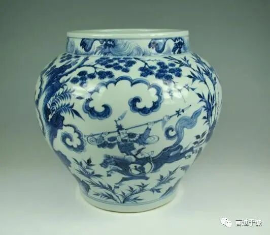 这件元青花罐高30厘米,口径22厘米,腹径36厘米,底径19.5厘米。罐身的内容取材于元代尚仲贤编写的杂剧《尉迟恭单鞭夺槊》第三折中的情节。讲述的是单雄信正在驱马追杀李世民,而尉迟恭手持钢鞭、策马疾驰赶来相救的战斗场面。专家因而将其定名为“尉迟恭单鞭救主”图罐。