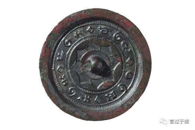 专家们连忙接过铜镜,认真研究起来。这块铜镜直径7.4公分,重约50克,为青铜质,呈正圆形。镜面平滑光亮,光可鉴人;镜背面中心有一钮,为半球形,内区为八曲连弧纹;外圈上有一圈极细的铭文,铭文共8字:见日之光,天下大明。这八个字之间,夹杂着一些“@”或“◇”符号。