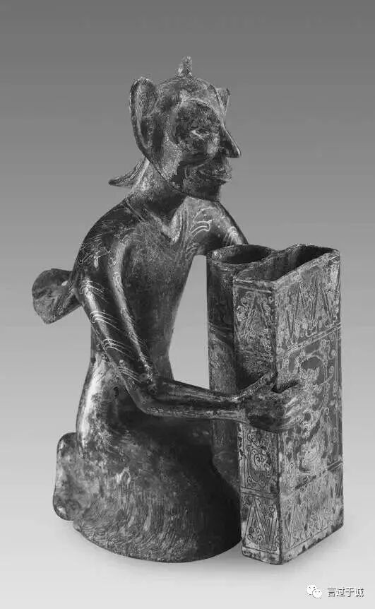 这是一件鎏金人形铜像,呈跽坐状,双手合抱着一个前方后圆筒形器,通高15.5厘米,底径9.5厘米,重1495克,其外貌非常奇特,脸长鼻尖,颧骨与眉骨隆起,两只长耳高高竖立,头发向后梳成锥形髻。猛然一看,确实很像是人类和鸟的结合。