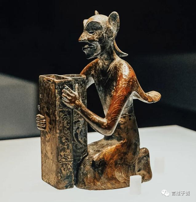 这件筒形器由两个模块构成,前方的是长方体,开口为长方形;后方的是一个圆柱体,开口为圆形。两个筒形器铸在一起,与羽人跪坐的双腿形成鼎立之势,保证了羽人的稳定性。