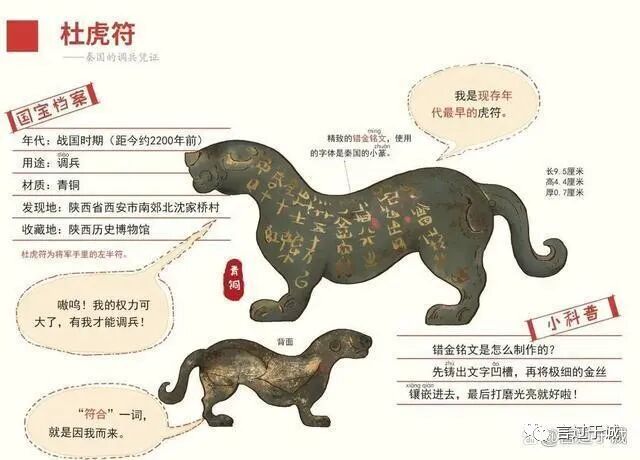 其大意是:调兵之符,右半由君王保管,左半在杜地的军事长官手中,但凡调动五十人以上,左符和右符必须契合并勘验无误,才能行动;若是遇紧急情况,必须点燃烽火预警,不用合验兵符,也能行动。这也是词语“符合”的由来,原意就是虎形兵符合二为一。