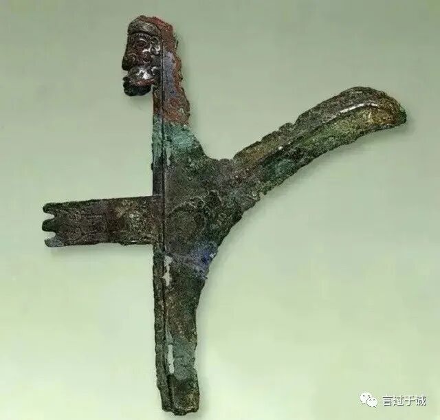 原来,在清理M2号墓出土的兵戈时,专家发现了一件极为罕见的兵器——人头形銎戟。戟端的人头像高鼻深目,长发蜷须,脸颊上还有“W”形纹身,为典型的北方游牧民族的形象!