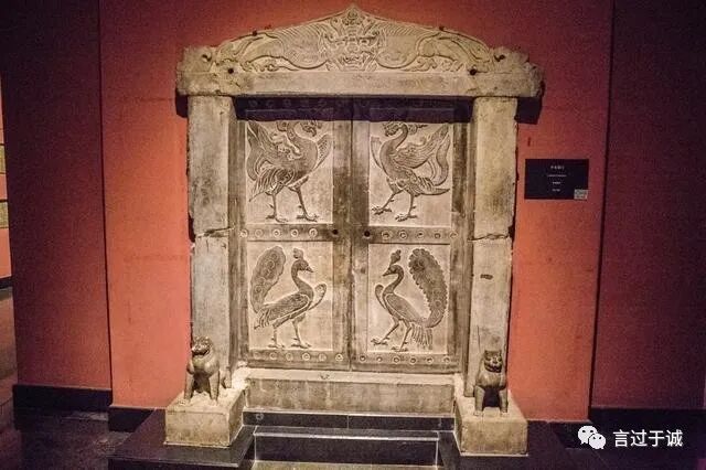在思索中,专家们走到了尽头,抬眼望去,一座极为豪华的石门映入眼帘。经测量,石门通高2.13米,宽1.77米,由门楣、额柱、门扉、门槛和狮形门墩组成。对开门扉分为四个区域,上面刻有两只朱雀,下面刻有两只孔雀。门额正中央是一个大型的彩绘贴金半浮雕兽首,怒目圆睁,让人望而生畏。显然,这是镇墓之兽。