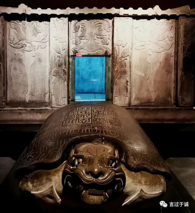 寻而不得,专家转而将目光转向了墓室中间的那具巨大的石棺椁。经测量,石椁高2.2米,长3.55米,宽1.85米,由28块青石组成,外形是歇山顶式的房屋建筑。四壁刻有朱雀玄武、文武大臣和仙人龙凤,线条流美,堪称石刻中的天花板。