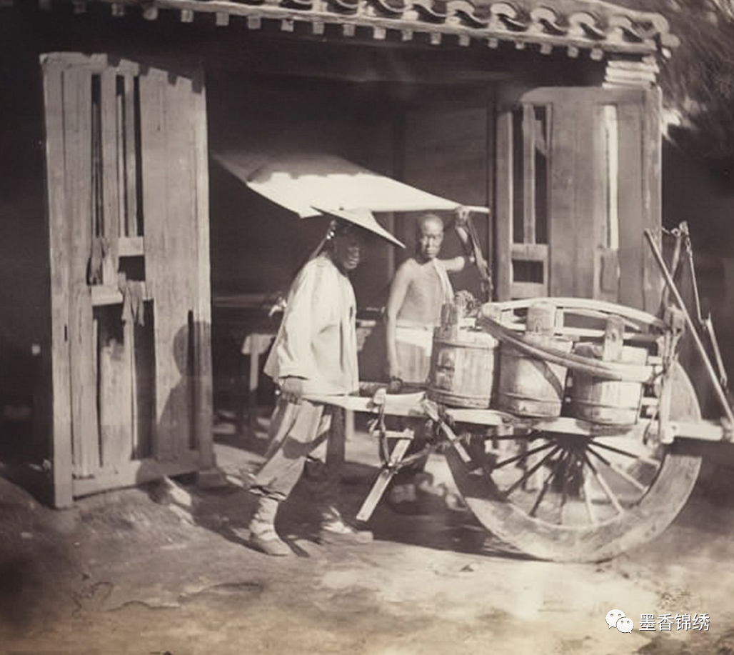 晚清年间老北京城里的送水工罕见旧照,老照片中的两位年轻男子咬牙在烈日下送水,双手用力推动着装满水桶的独轮车。彼时的京城内井水大部分非常苦涩难喝,根本无法饮用食肆。而居住城内的百姓只能到城外取水,而这一来一回的路程遥远,因此就催生了这送水工一职。