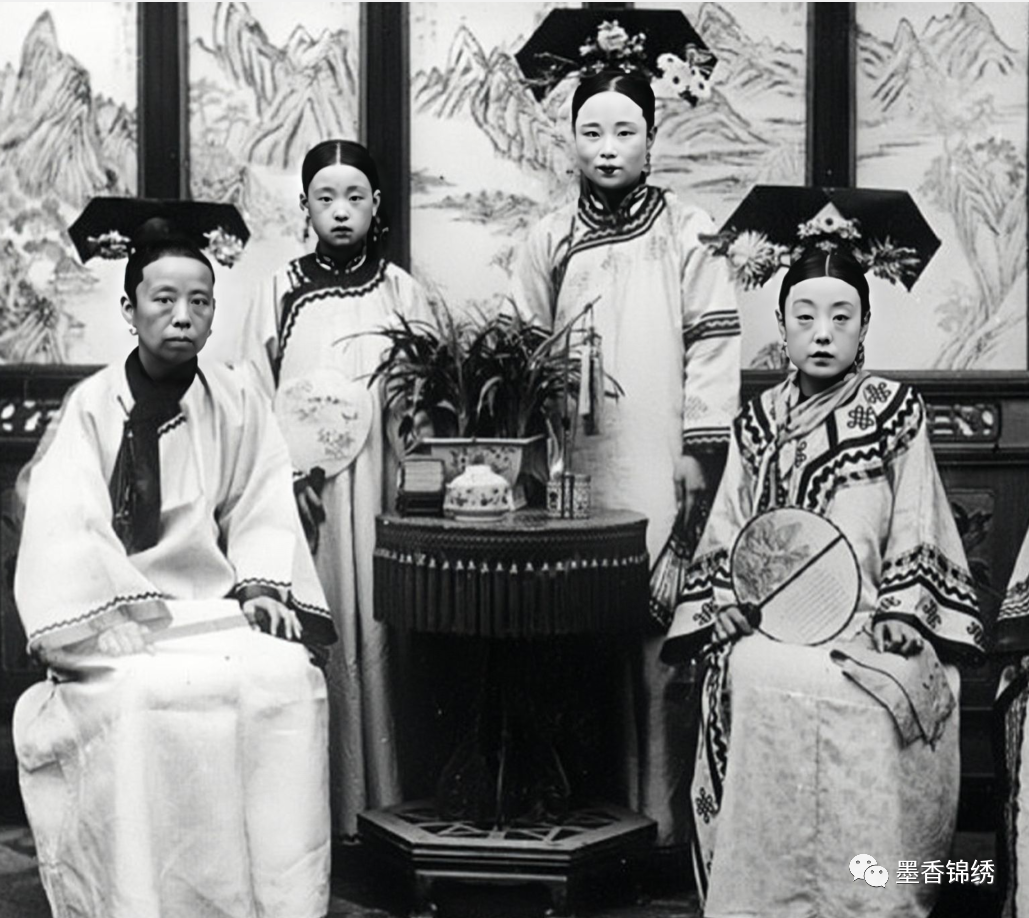 晚清年间一位京城王爷家的原配与妾室们的同桌合影,老照片中的王府三妻四妾环肥燕瘦各有千秋,每一位夫人接受穿着华贵精致的旗装,相貌亦是十分貌美多姿且有气质。