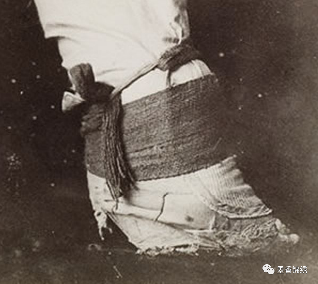 晚清时期,一位青楼妓女裹三寸金莲取悦客人时留影旧照。据历史文献记载,晚清年间的汉人女子于六岁左右就开始缠足。其具体缠足方法为将其脚趾骨折断,然后用长长的裹脚布将小脚包裹成型,其中痛苦与心酸难以启齿而出。