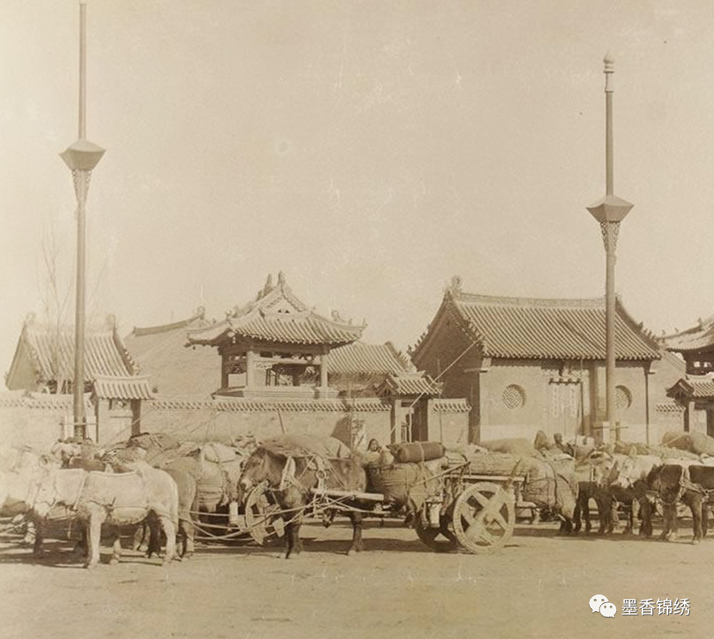 晚清1895年时期的营口西大庙门前留影旧照,老照片中的清军部队正在着急忙慌地将物资运往战争前线。在那场举世瞩目的甲午战争之中,外强中干的清朝军队不但在海战之中连连失利,而且于陆战时亦是接连溃败、溃不成军。后来日军踏着铁骑侵入了辽宁,仓皇而逃的清军毫无任何抵御能力。
