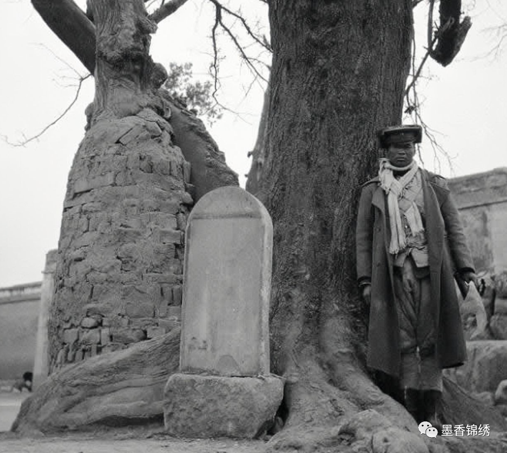 民国年间陕西华阴一带的古柏树旧照,一个高个男子神情忧郁地站在树下留影。根据摄影师克拉普在老照片中注释的信息,该古柏树已经有了两千五百年的历史,于老子在西游之时,还曾将他的坐骑青牛栓在此树上,而一旁较小的树亦是有着五百多年之久。