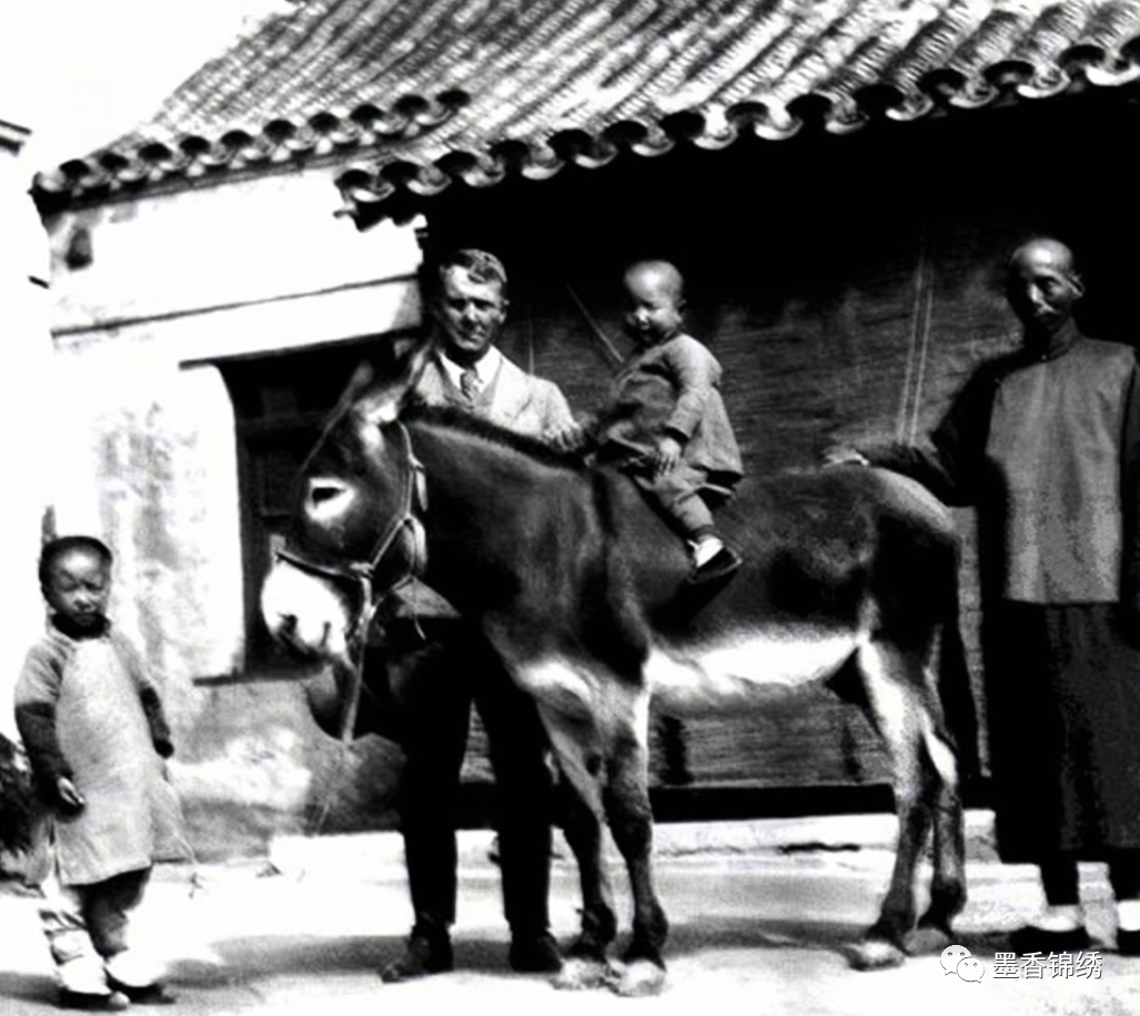 晚清时期的驻华记者莫理循在院子里与管家及其孙子的合影旧照,老照片中骑在毛驴上的孩子是管家孙天禄的孙子,莫理循对他非常疼爱。于晚清1902年之时,莫理循在京城里的王府大家花了七百五十英镑置办了一所宅院。其宅子宽阔气派,有六十二到一百零七米,被人们称之为“莫公馆”。