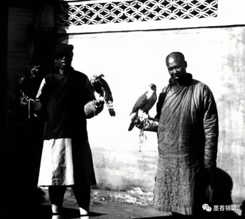 晚清时期京城里常见的驯鹰人与老鹰的合影旧照,众所周知旧时的老北京人将驯鹰、养鹰作为日常消遣事宜之一。而世人皆知老鹰向来习性异常凶猛,驯鹰人为了消除其野性,所以“熬大鹰”便是玩鹰的首要任务之一。而驯鹰一般为三班倒工作,驯鹰人将鹰用铁链栓在自己的手臂上,让其站立几个通宵达旦,其鹰的野性便可慢慢消除,继而认其驯鹰人为主。