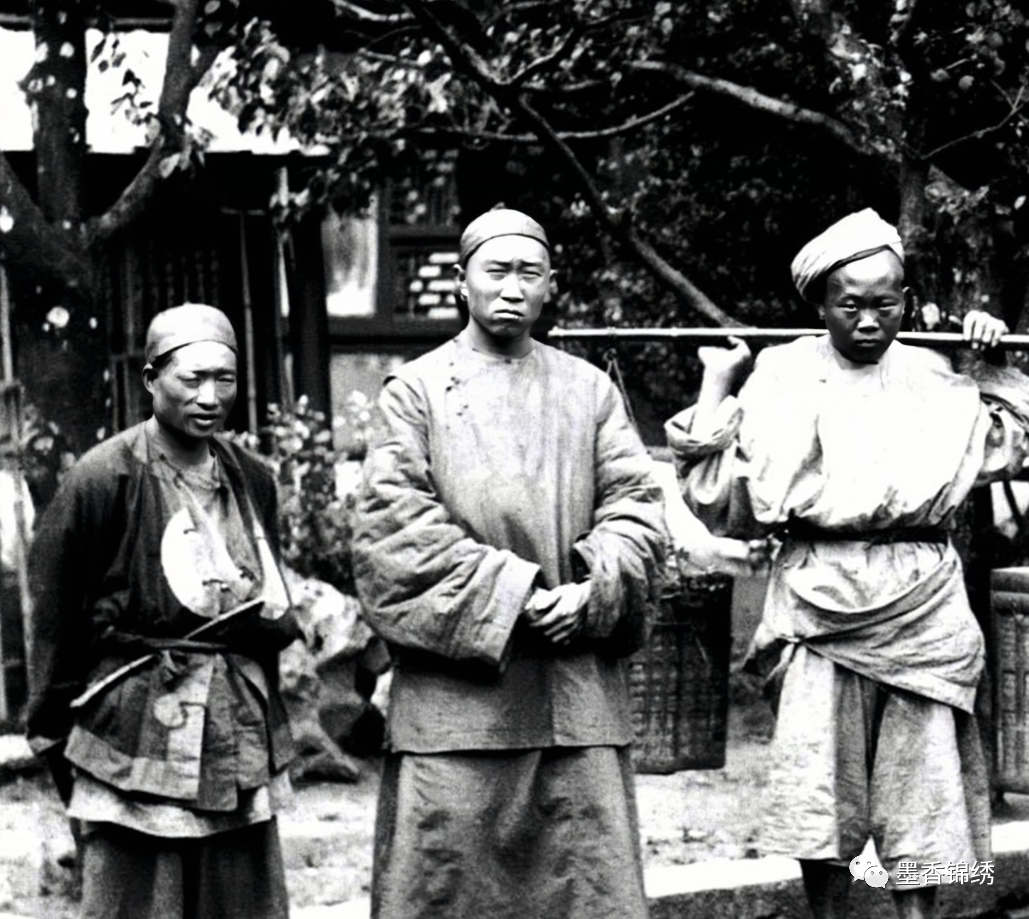 晚清时期的驻华记者莫理循在云南考察时雇佣的仆人与衙役旧照,站在其左边的其实是护其安全的官府衙役,中间之一乃是其马夫,右边的才是其挑担子的仆人。记者莫理循在传记中特别提到:“这些人非常节俭,每日只吃两顿饭,而且食量极少。他们挑担子可以得到不菲的收入,但是却仍旧勤俭,十分令人钦佩。”