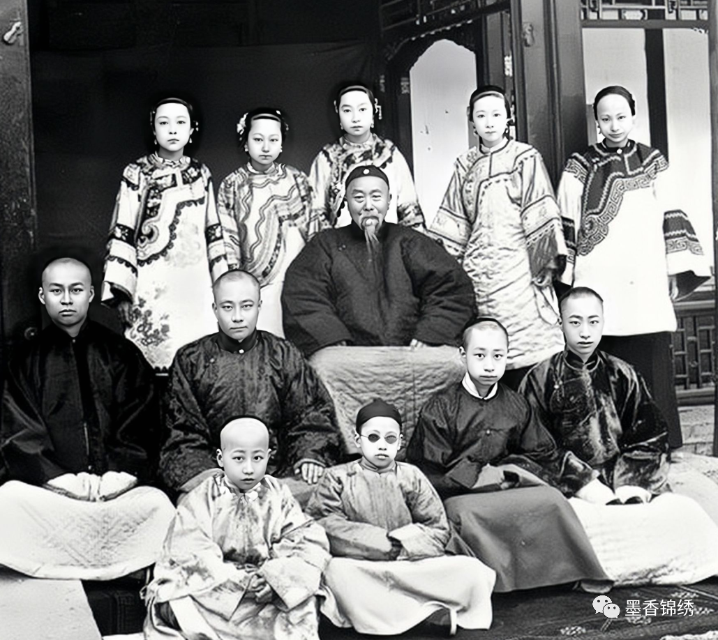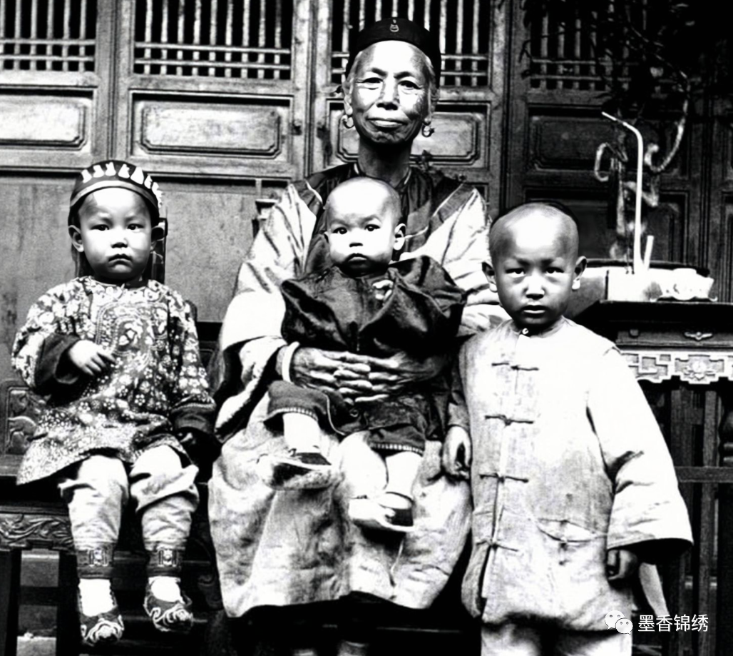 晚清时期一个云南的妇人与孙儿们的合影旧照,驻华记者莫理循在传记中表示非常同情清朝妇女命运:她们的命运被枷锁桎梏,被家庭与儿孙困扰,并不像西方女性那样自由与幸福。然而她们却依旧乐在其中,好像自愿一生为家庭奉献出所有的时光与精力。