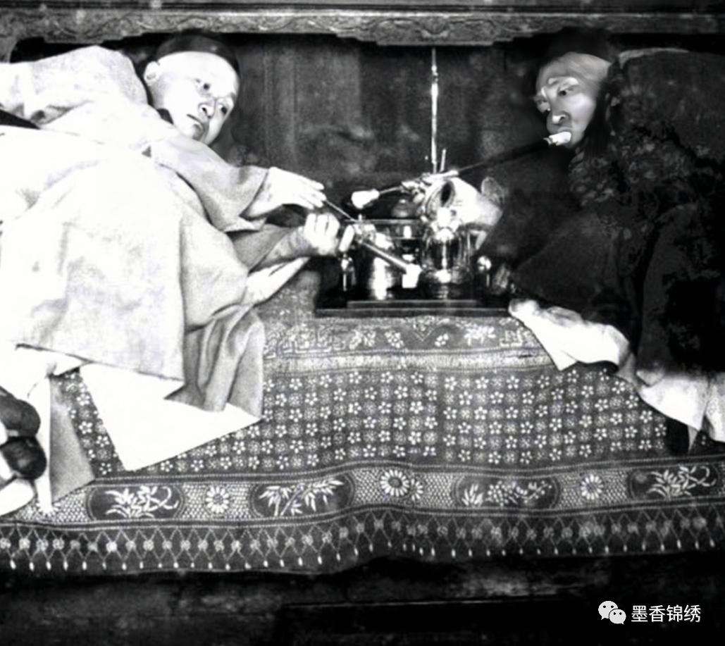 晚清年间两个中年男子卧榻吞云吐雾吸食鸦片的场景旧照,其实彼时的清廷早就三申五令严禁吸食鸦片,但是民间的百姓却并不为然,甚至还买来鸦片种子四处种植。就连身居高位的朝廷官员亦是躲在小巷子里吸鸦片,整个清朝从上至下皆是一旁烟雾缭绕的腐败糜烂。