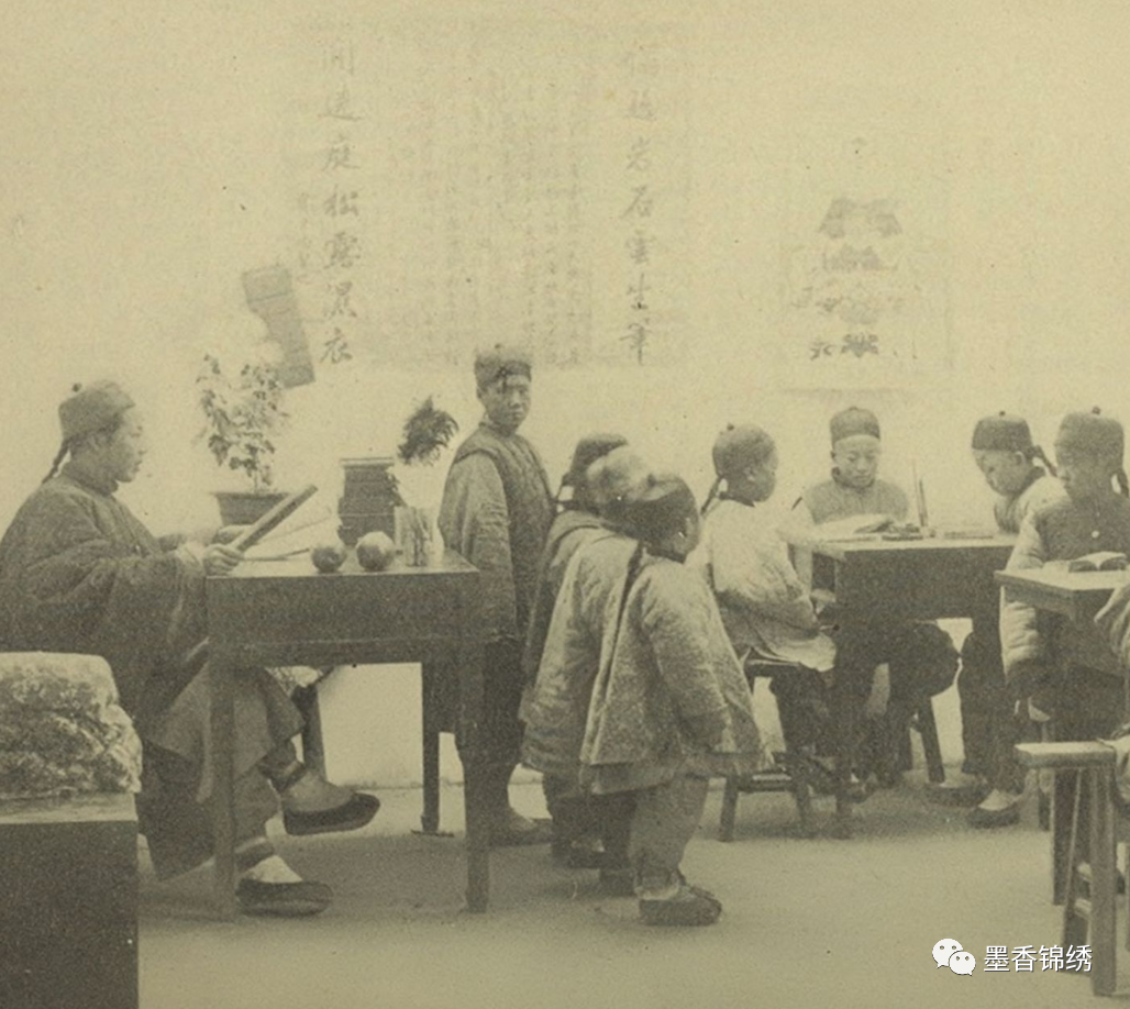 晚清末年一家私塾里的师生们上课时留影,老照片中有几个年幼的学童看起来被罚站,教书的老先生则神态悠闲地端坐身后。其实古时候的读书场所甚少,一种是朝廷所办的官学,专供达官贵人子弟读书习字。第二种则是有钱人家所聘请的私塾老师,以捐钱、或聘请的方式,让其设馆收费教学。