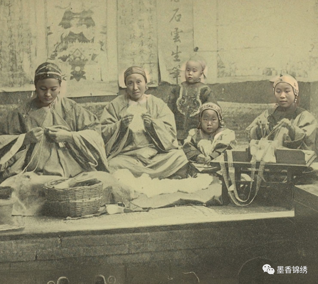 晚清时期一家后院女眷在闺房内做针线活时的合影旧照,老照片中的原配与小妾坐在榻上缝衣服,身旁还有几个年幼的孩子在学习,一副其乐融融相处和睦的美好家庭画面。古人推崇“女子无才为德”之说,因此当时的女子们大多数以学习针线女红为主,以便嫁人后更好地打理夫家诸人的一切日常事宜。