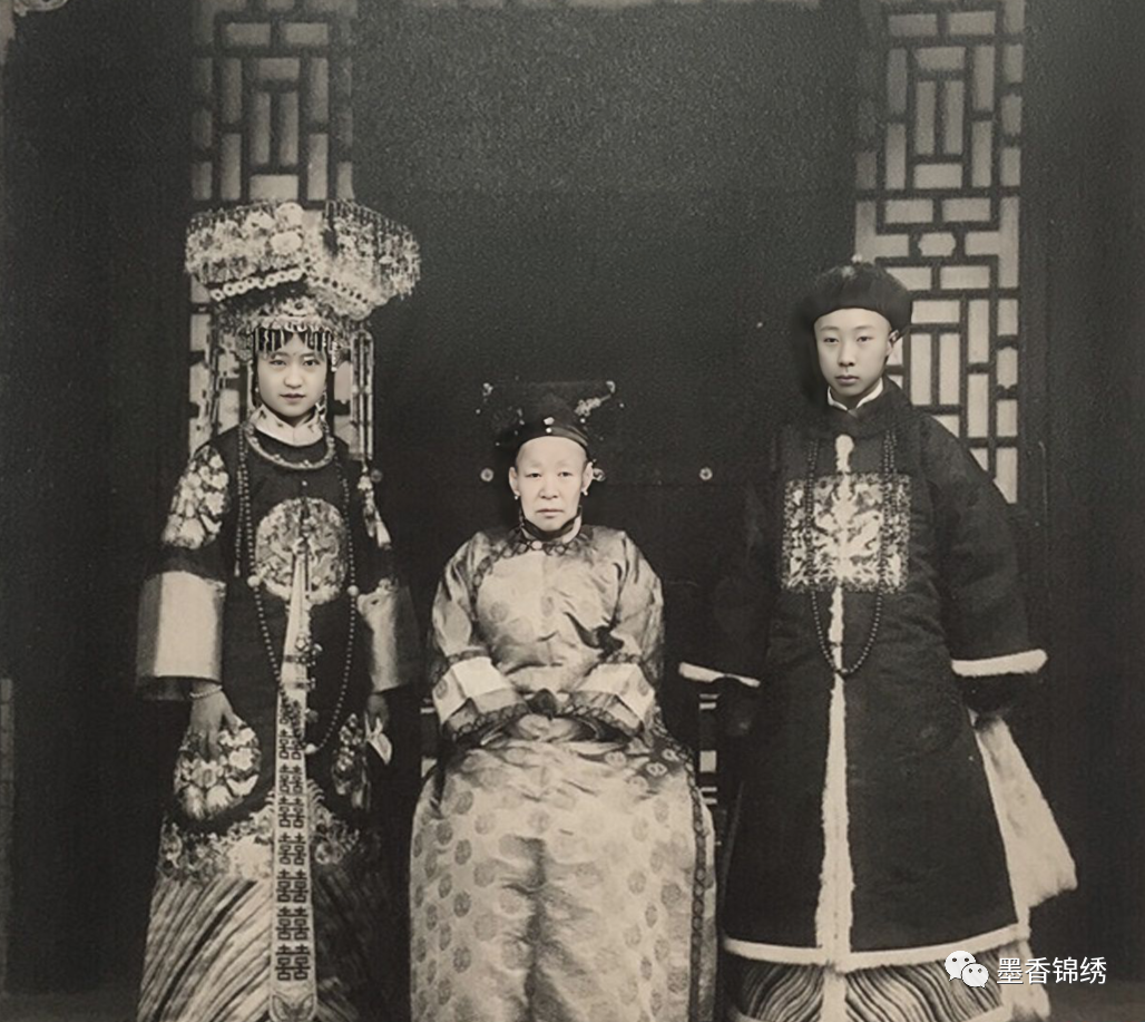 晚清年间一户旗人家庭的新婚夫妻的留影,老照片中的旗人新娘头上带着凤冠挑杆钿子,乃是清朝的皇族女子中最为流行的钿子款式。而若是旗人女子在成婚时,新娘则戴有二十四根挑杆钿子,然后身着女八团吉服,将旗人女子的富贵典雅展现得非常完美得体。