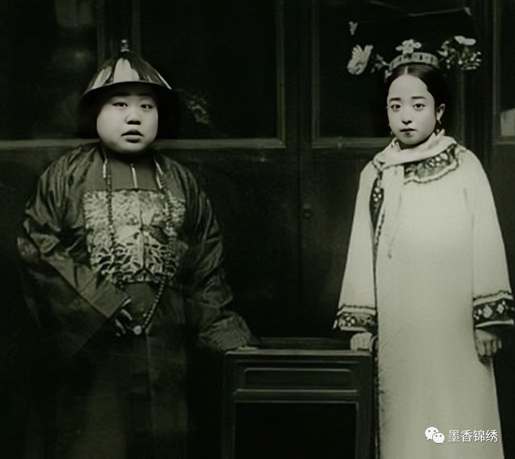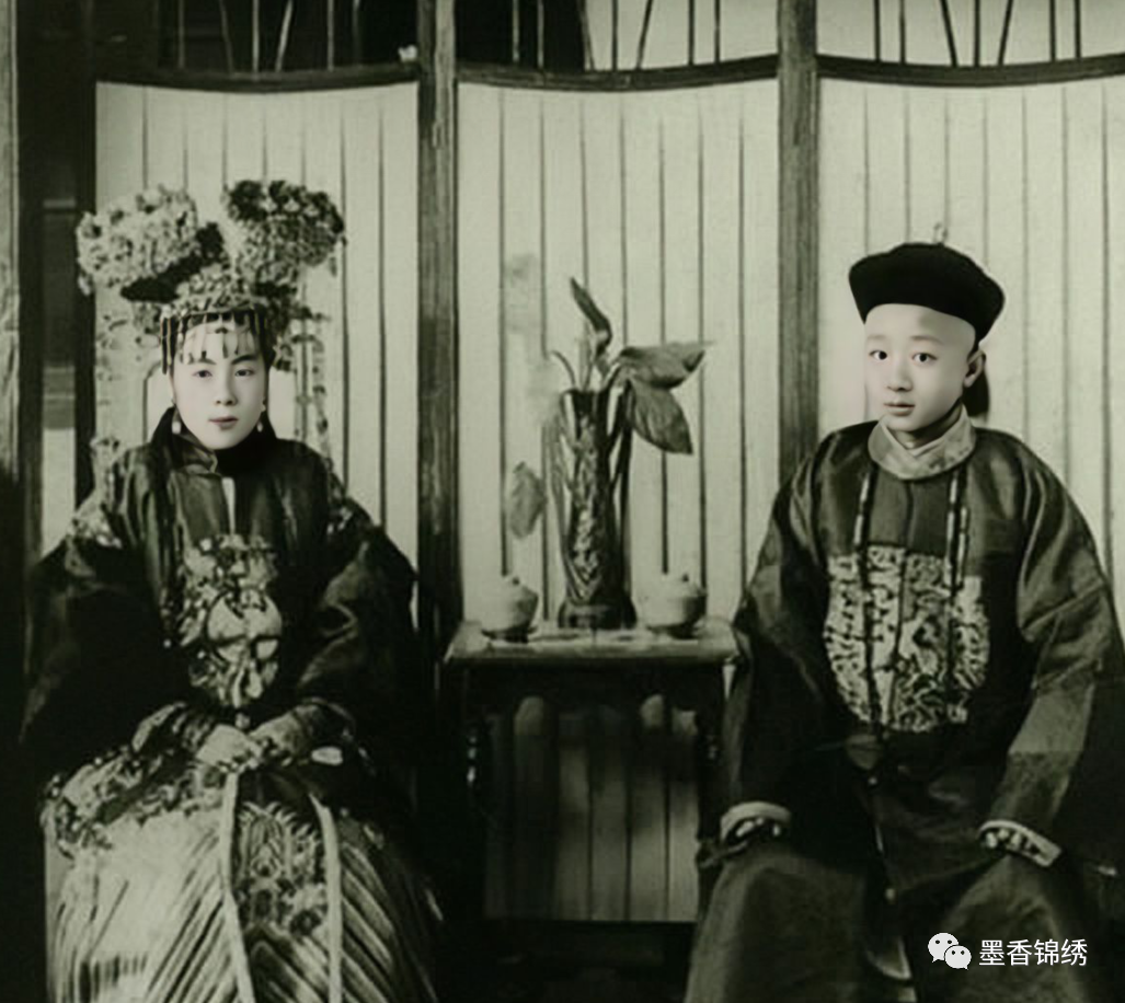 晚清年间的皇弟溥杰与王妃唐石霞大婚之喜时的合影旧照,老照片中的王妃唐石霞不但带着缀满珠宝首饰的凤冠旗头,而且其身上所穿的婚嫁八团吉服褂更是精美华贵。众所周知溥杰乃是晚清宣统皇帝溥仪的同胞兄弟,因此其大婚所办皆是按皇室最高等级礼制。