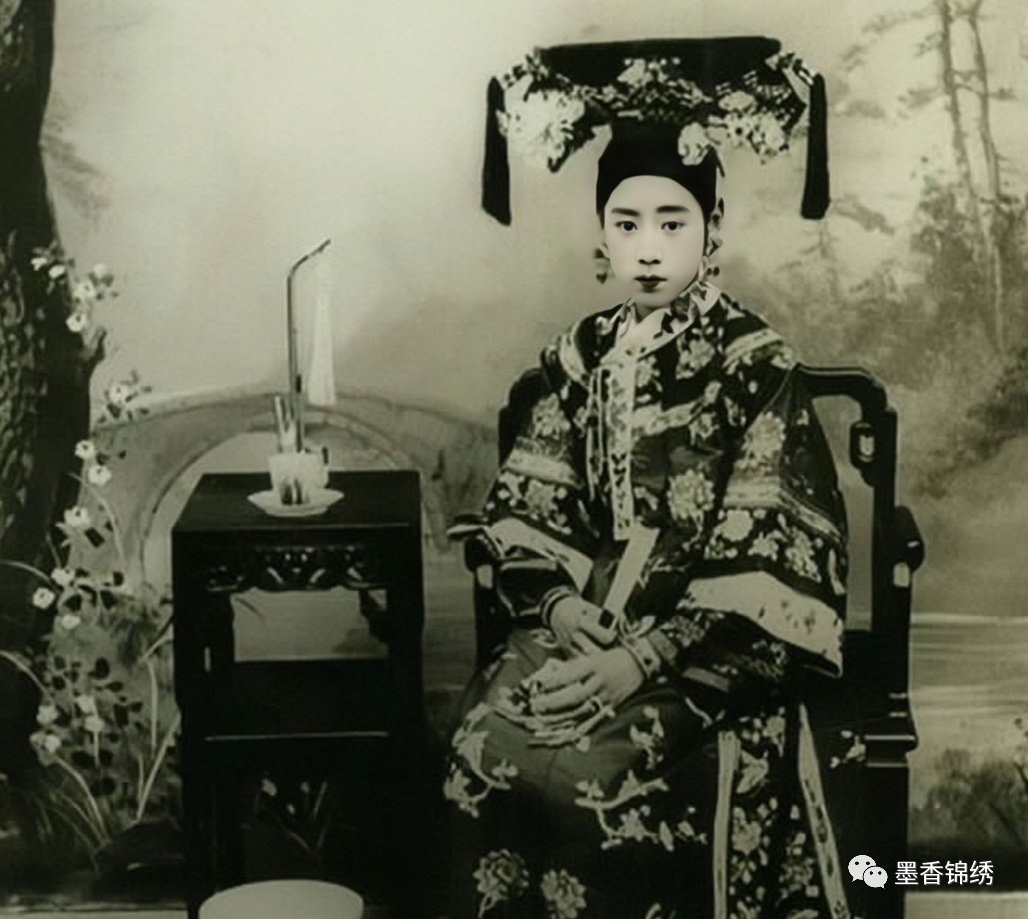 晚清年间的皇族贵妇的肖像,老照片中的年轻贵妇穿着华贵的氅衣锦服,头上戴着旗人女子特有的大拉翅。受朝廷赡养的旗人家庭无需老照片,每月按时可去朝廷领取一定的俸禄与钱粮,因此彼时的旗人们大多数都过着锦衣玉食的奢侈生活。