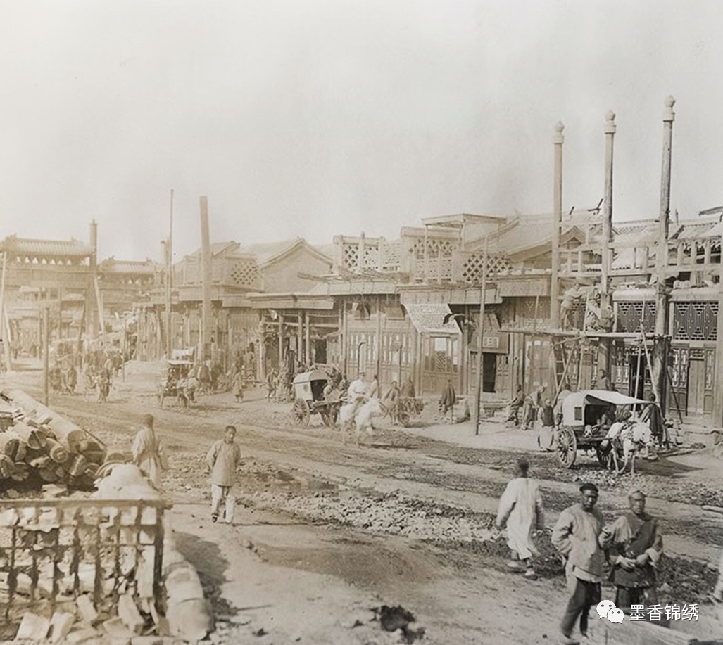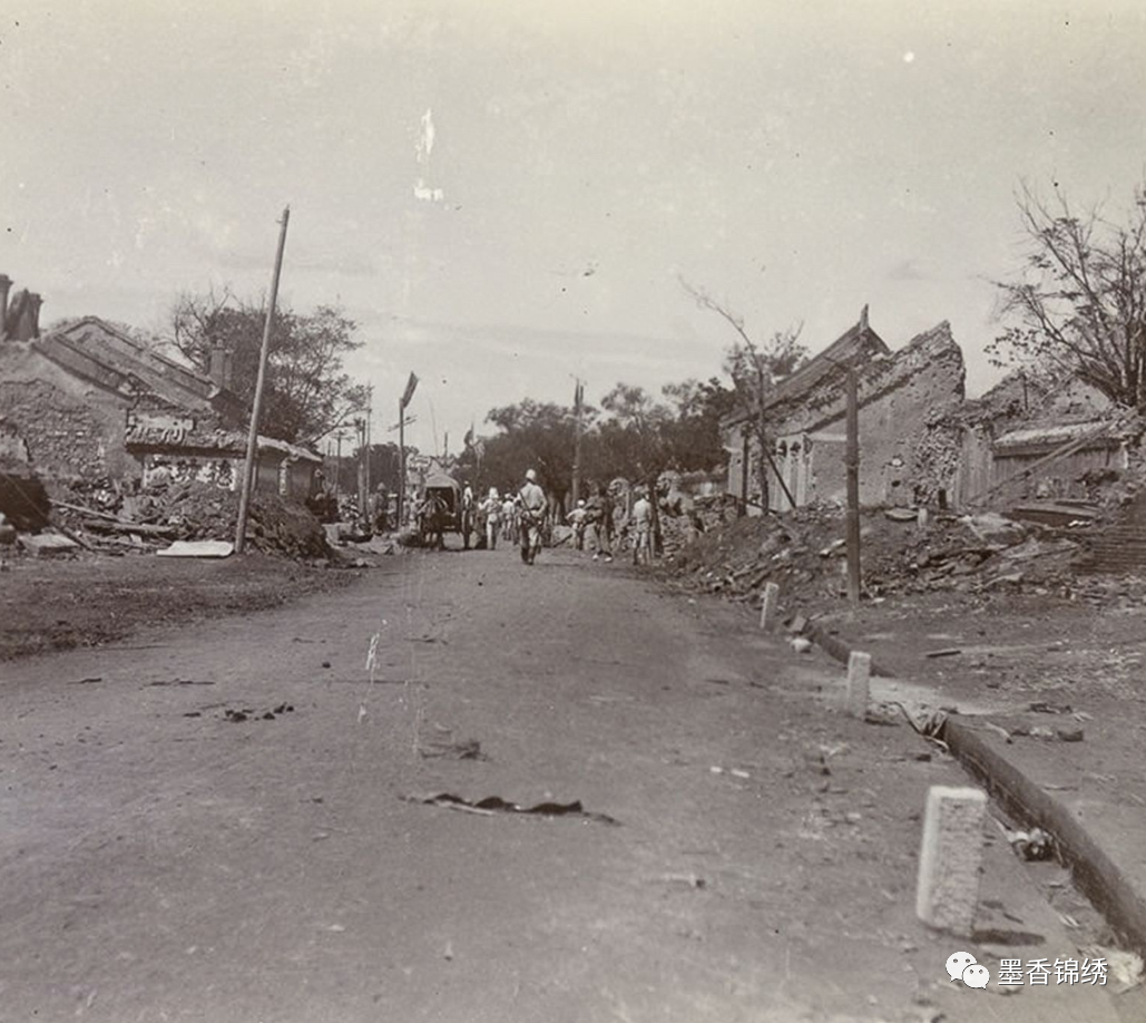 晚清时期京城里前门大街附近的商业区街道被义和团摧毁后留影,彼时的前门商业街到处都是鲜鱼口、大栅栏商铺、洋布、洋袜子、洋蜡等各种格式的洋货店铺。于晚清1900年6月16日之时,义和团在起义中将此地付之一炬,其熊熊燃起的大火烧了整整三天三夜,其中被烧毁的店铺有四千多家。