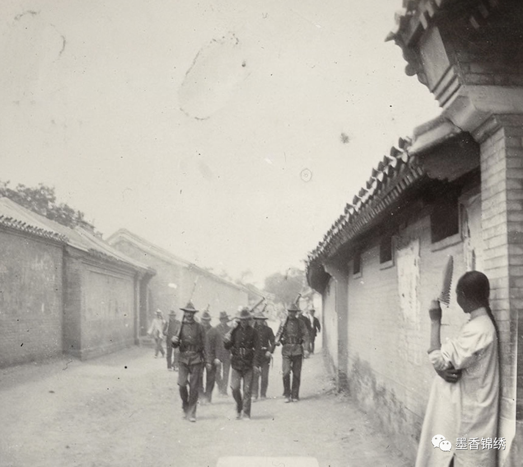 晚清时期老北京城里一名男子眼睁睁看着八国联军进村时悲伤场景旧照,自古国土不宁百姓哀,老照片中的男子虽然堂堂七尺男儿,然而面对着嚣张跋扈进村的侵略者,却因手无寸铁只能眼睁睁看其进村扫荡,满腔的愤怒和怨怼只能深埋心中。