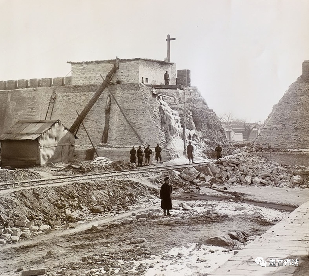 晚清时期老北京城里永定门附近的城墙被八国联军挖开炸毁时旧照,其实从以上种种历史老照片来看,不难看出曾经无比辉煌的帝王之都遭受了一场多么重大的灾难。曾经繁华热闹的商业街一夜之间成为断壁残垣的废墟,而气派巍峨的皇家城门亦是片段轰然倒塌成泥。