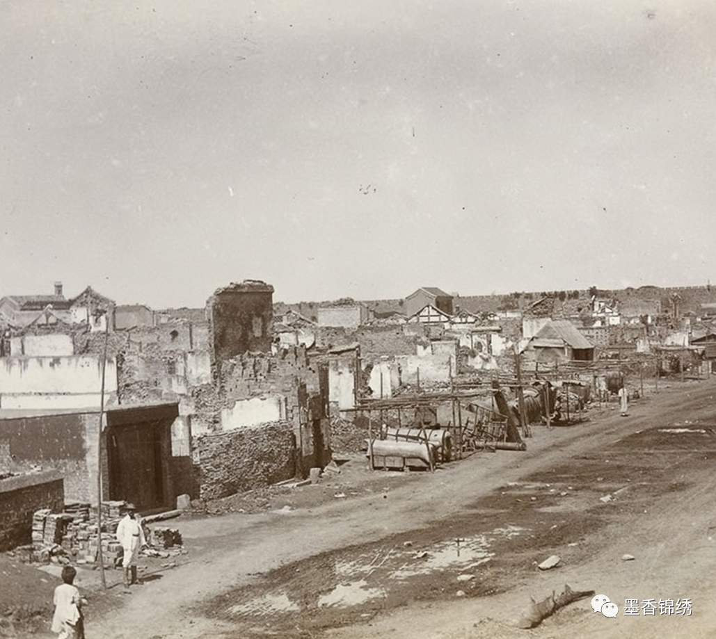 晚清时期被八国联军与义和团炸毁的商业街,老照片中满是冷清凌乱不堪。义和团在战争之中曾多次号称“我等为天选之人,亦有神功,能烧毁其中的教民房屋,却不波及无辜平民。”然而不管义和团说得如何天花乱坠,其在战乱时所纵下的大火,却烧毁了无数百姓们的房舍茅屋,因此事后亦是遭到了黎民百姓的抵制与质疑。