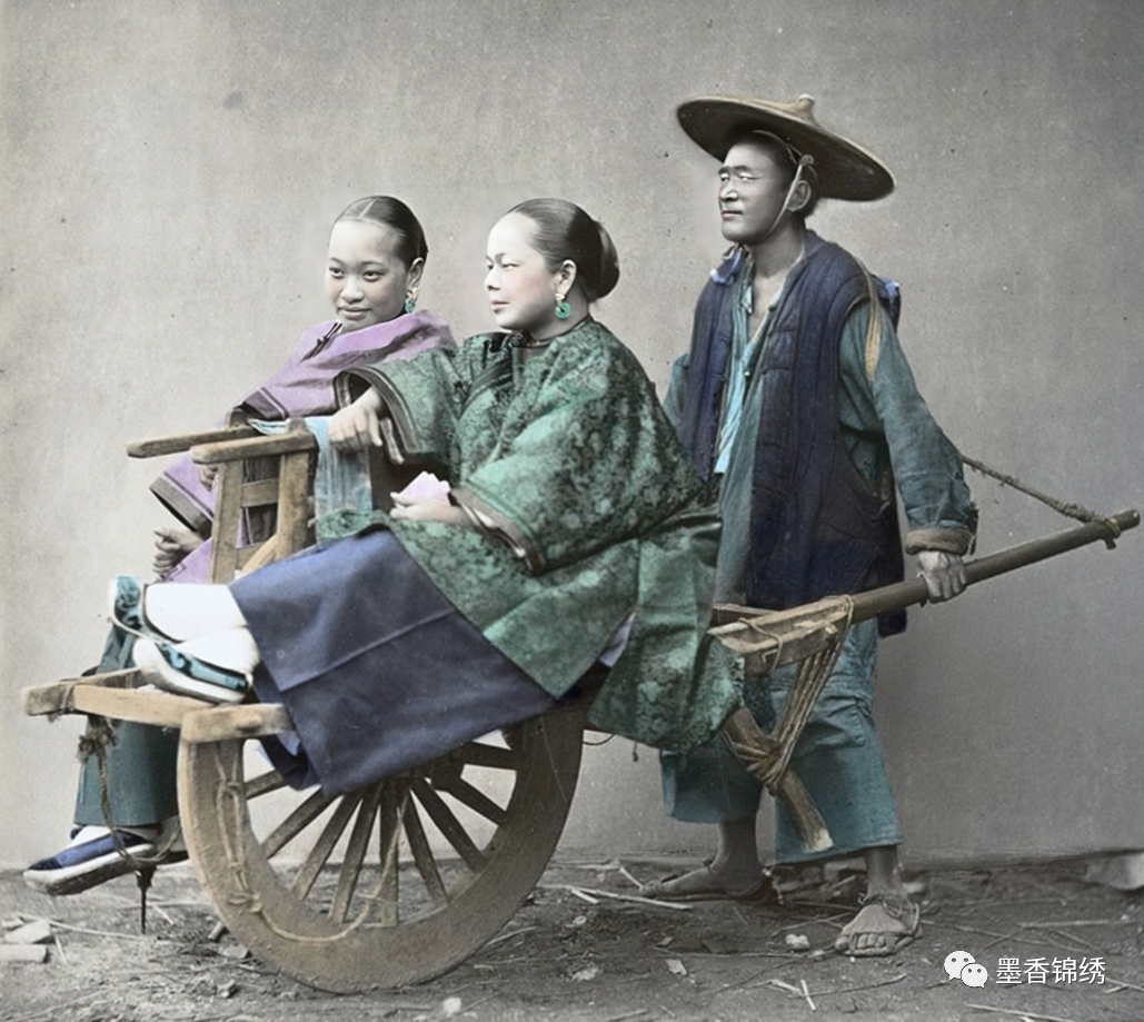 晚清时期一个乡村老汉推车时有趣画面旧照,坐在独轮车上的原配与小妾笑脸如靥,似乎十分享受这乘车的愉悦之感。其实古时候的独轮车在民间非常常见普遍,这种小型的独轮车载人运物皆都十分方便,而且使用起来亦是非常的灵活小巧。不管是崎岖道路还是平坦大道,只要掌握了其独轮车的平衡技术,亦是能给快速使出前行。