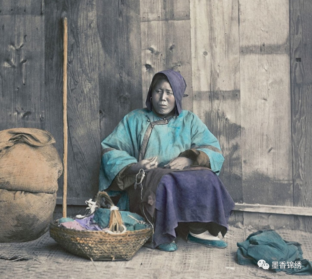 晚清年间的穷人家妇女在大街上着缝补生意时罕见旧照,在晚清末年时期,很多摄影师开始效仿雷蒙德对照片进行手工上色,以求被上色后的照片能得到更加还原人物风貌的效果。本组的摄影师雷蒙德原本就是一位非常著名的写实画家,因此他对色彩的运用比寻常人更加的敏感精湛,因此其为照片上色的手工技术更加的出众。在当时那个贫穷落后的年代,摄影师雷蒙德的拍照技术在同时代的同行之中算得上是屈指可数。