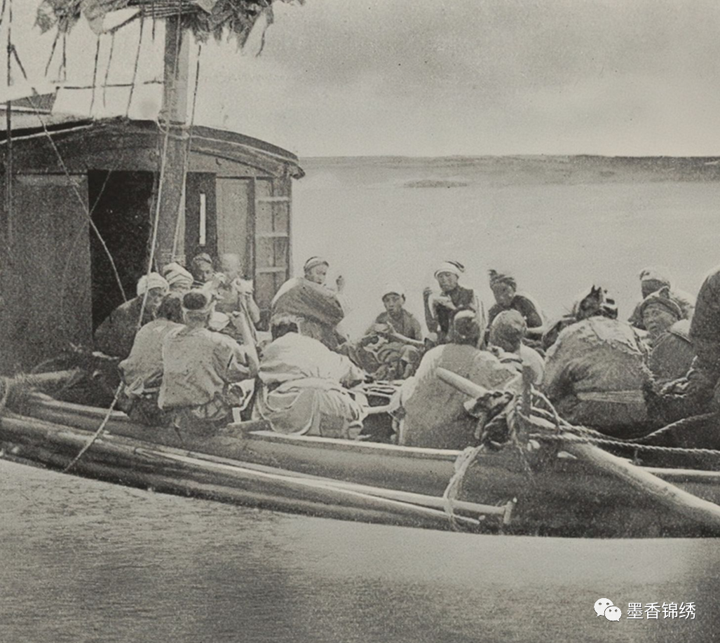 晚清时期长江上的纤夫在吃饭时旧照,在面对女旅行家伊莎贝拉在面前舞弄着照相机,船上的长江纤夫们忍不住哄堂大笑,好像在看一个前所未见的新奇玩意。而作为摄影师的伊莎贝拉却对他们十分同情:这些人活在最低贱的阶层,其工作时非常残酷且无人道。他们未曾遭受虐待,喜欢嬉戏,爱开玩笑,激灵地模仿前来拍照的外国人,非常具有诙谐的幽默感。