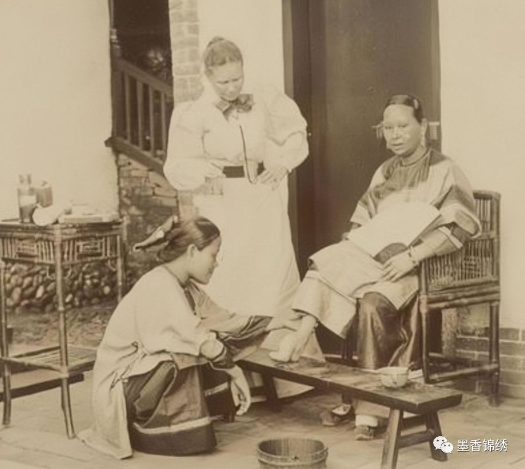 晚清时期一户人家的偏房小妾蹲下身给原配洗脚时旧照,其身旁还站着一位正在仔细观摩的外国妇女。当时的外国人对清朝女子的三寸金莲小脚非常感兴趣,于是时常前去花重金聘其前来展示拍照。而古时候身为偏房小妾之人,原本就是家中丈夫与原配夫人的奴仆,因此小妾蹲下身为原配洗脚亦是常见之事。