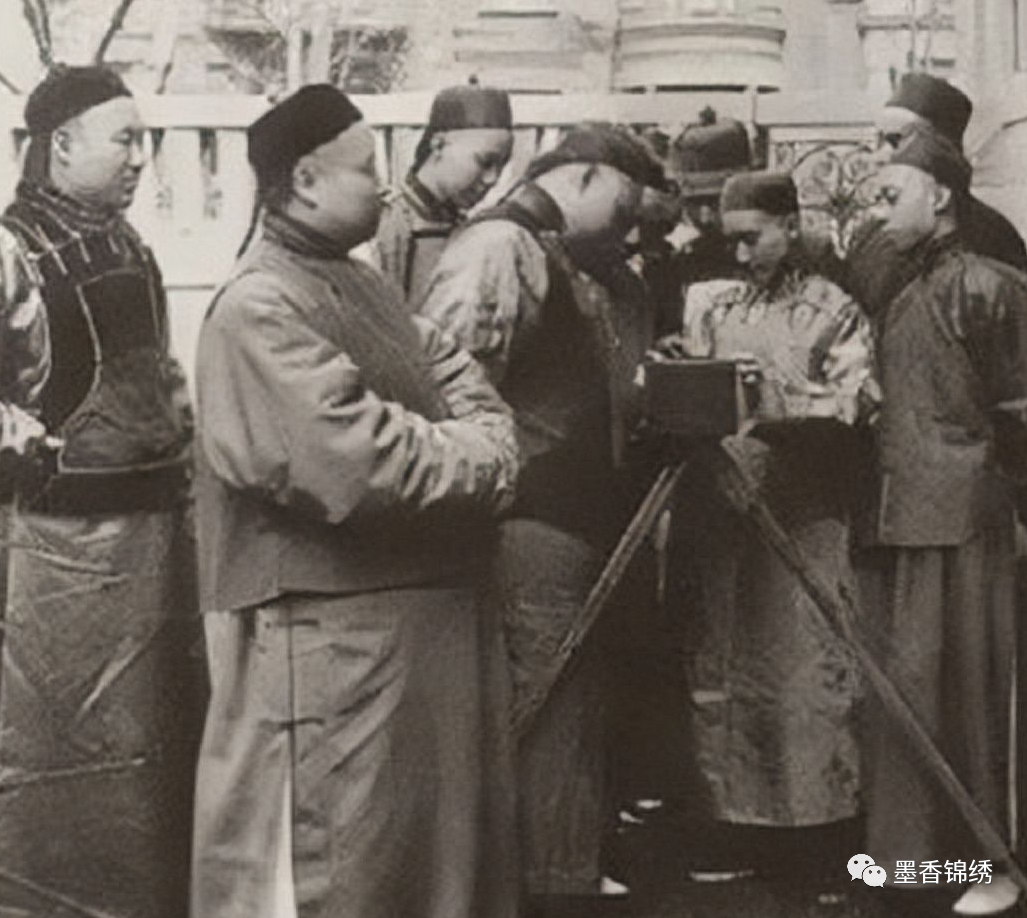 晚清时期的有钱人家男子们在街头围观照相机时场景旧照,彼时的照相机在上流社会中属于稀奇物品。而当时能有钱购买相机拍照晚清社会风貌与人物肖像者,大部分都是外国人居多。而晚清时期的百姓们很多人认为照相机能取魄摄魂,因此极少数对其感兴趣。