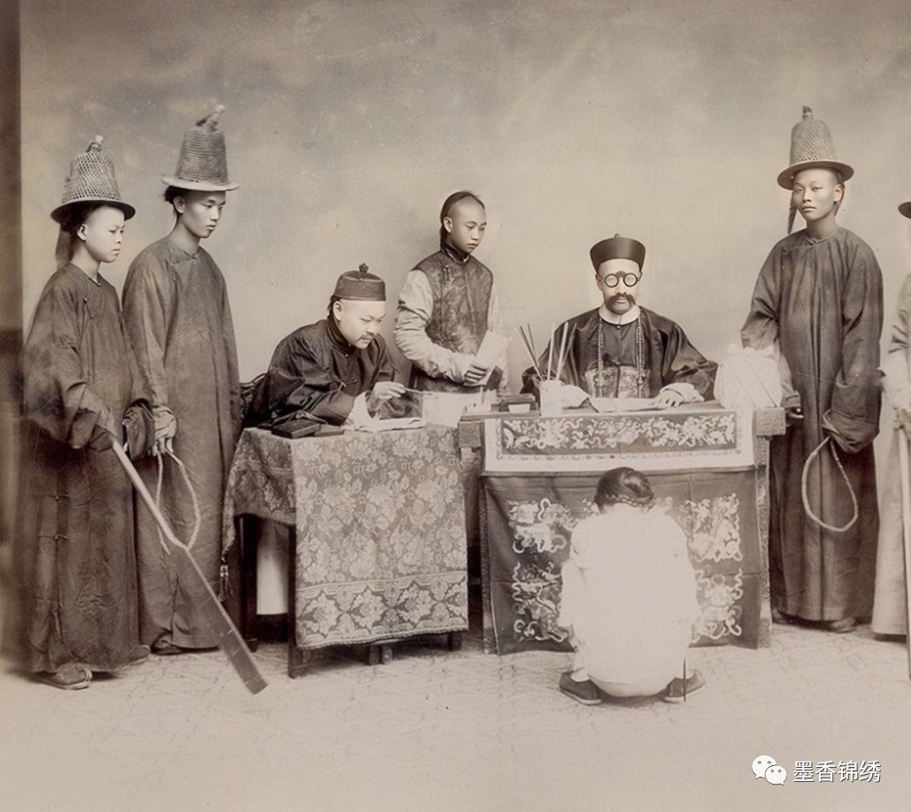晚清1890年一家照相馆里布置的公堂情景,一位九品县太爷正在公堂审案,台下跪着一名瑟瑟发抖的犯事之人。看过晚清时期百姓生活照片的人的文者,皆认为彼时的人们皆是一副神情呆板麻木的样子。其实真实的原因是因为当时的拍照技术不成熟,其拍照曝光需要非常长的时间。而被拍照的人在等待中逐渐变得表情僵硬,因此才会出行麻木无神的表情。