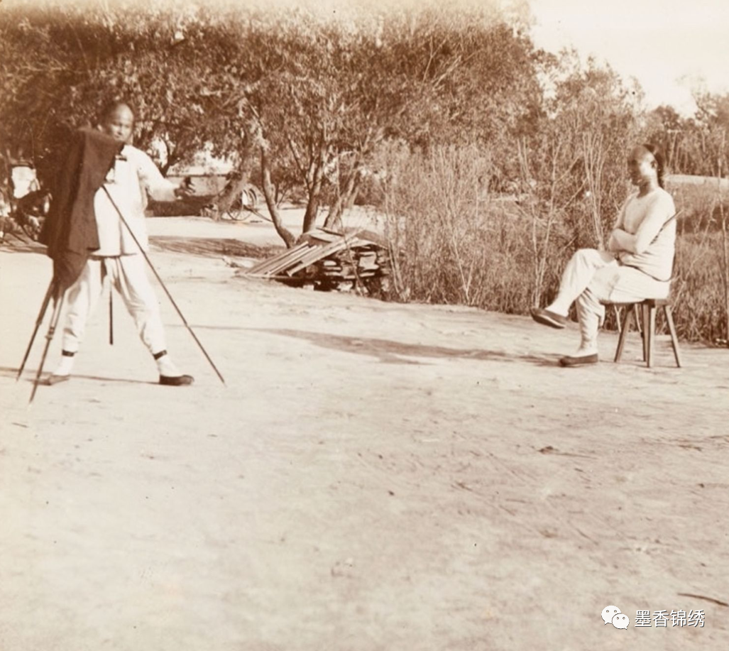 晚清时期的男子在户外拍照时的有趣画面,当时很多中国摄影师的学艺皆是从照相馆开始。他们首先会在西方摄影师的照相馆里打工学艺,然后当他们学成那繁复的拍照技术后,会想方设法去购买摄影器材,然后单独自立门户开设照相馆。