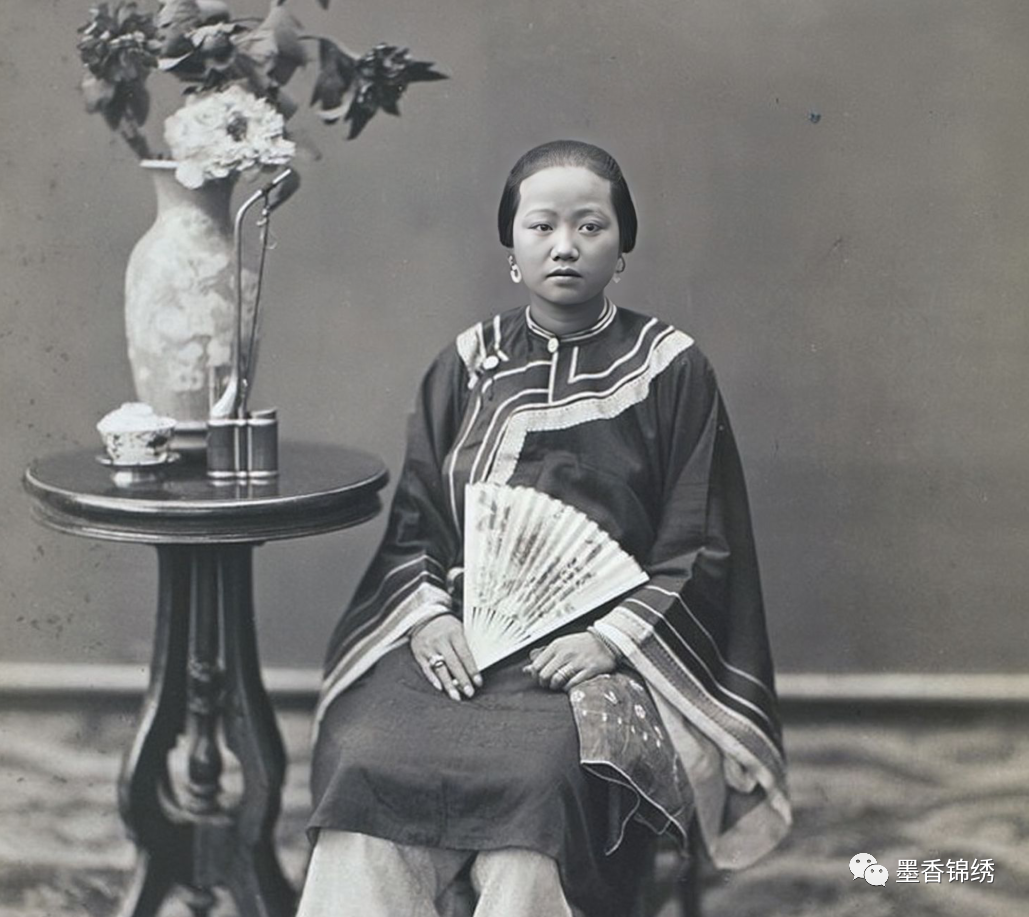 晚清1880年时期一位广州女子的肖像老照片,旧照中的场景亦是百余年前照相馆里常见的布置之景。其室内有着一张典雅精致的圆桌,其地上铺设毛毯,人物正面对着摄影师手中的照相机,一双纤纤玉手上还拿着折扇与手绢。