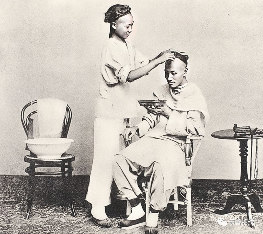 晚清年间的理发师为顾客剃发时场景旧照,其实彼时很多外国摄影师在拍照时都曾受到不同程度的殴打。当时西方国家频繁侵略清朝,原本两国之间就有着无法释怀的深仇大恨。因此当金发碧眼的外国摄影师到处拍照时,很多百姓们都会伺机去行殴打报复之事。