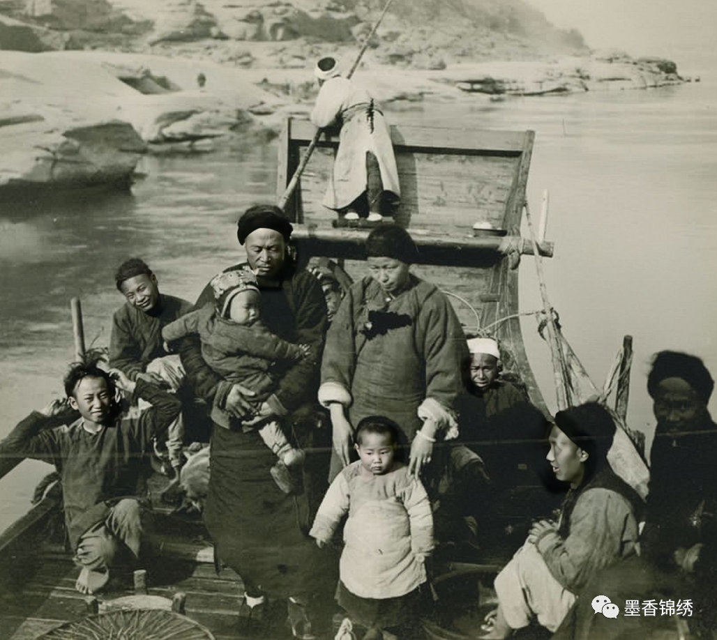 晚清1900年一位年长的船主与家中妻儿及仆人的合影旧照,从此穿着上来看,还算是当时的小康安稳之户。彼时的四川经济与文化皆都处于停滞不前的局面,甚至于1911年建设铁路之时,当时很多民间百姓人士希望能以集股的方式自办,然而清廷却要求收归,后来引发了四川的保路运动事件。
