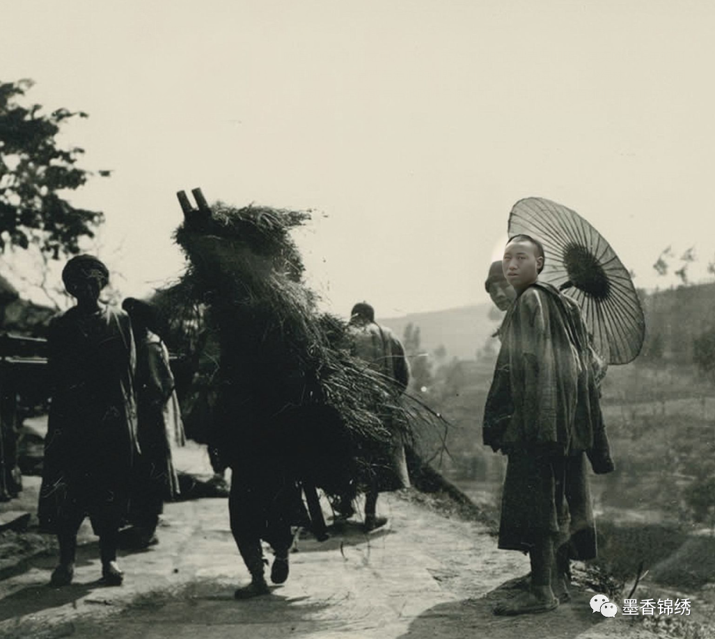 晚清1909年的3月,一位乡村百姓在小道士搬运柴火草时候的留影旧照。通过这些珍贵的历史影像来看,虽然当时四川一带的百姓们生活并不算富裕,但是至少没有看到四处皆是乞讨之人的景象。相比起北方一带的街头饥民,四川地带的百姓过得还算安稳知足。