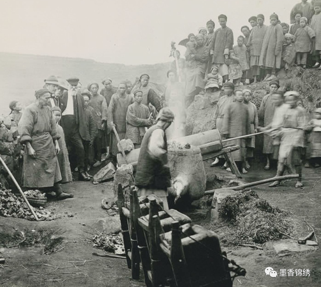 晚清1909年的4月,一群铁匠在荒郊野外铸造犁头时罕见旧照。晚清时期的四川对比于其他城市,其社会经济与民生现状皆算得上富足优渥。即便后来民国时代开启,然而仍有不少人对晚清末年的四川生活念念不忘,甚至在书籍《渠县志》中写道:“回想当年满清盛世,世道百物低廉,生计样样饶足,家家户户钱银充盈,乃是大丰亨之景象。”