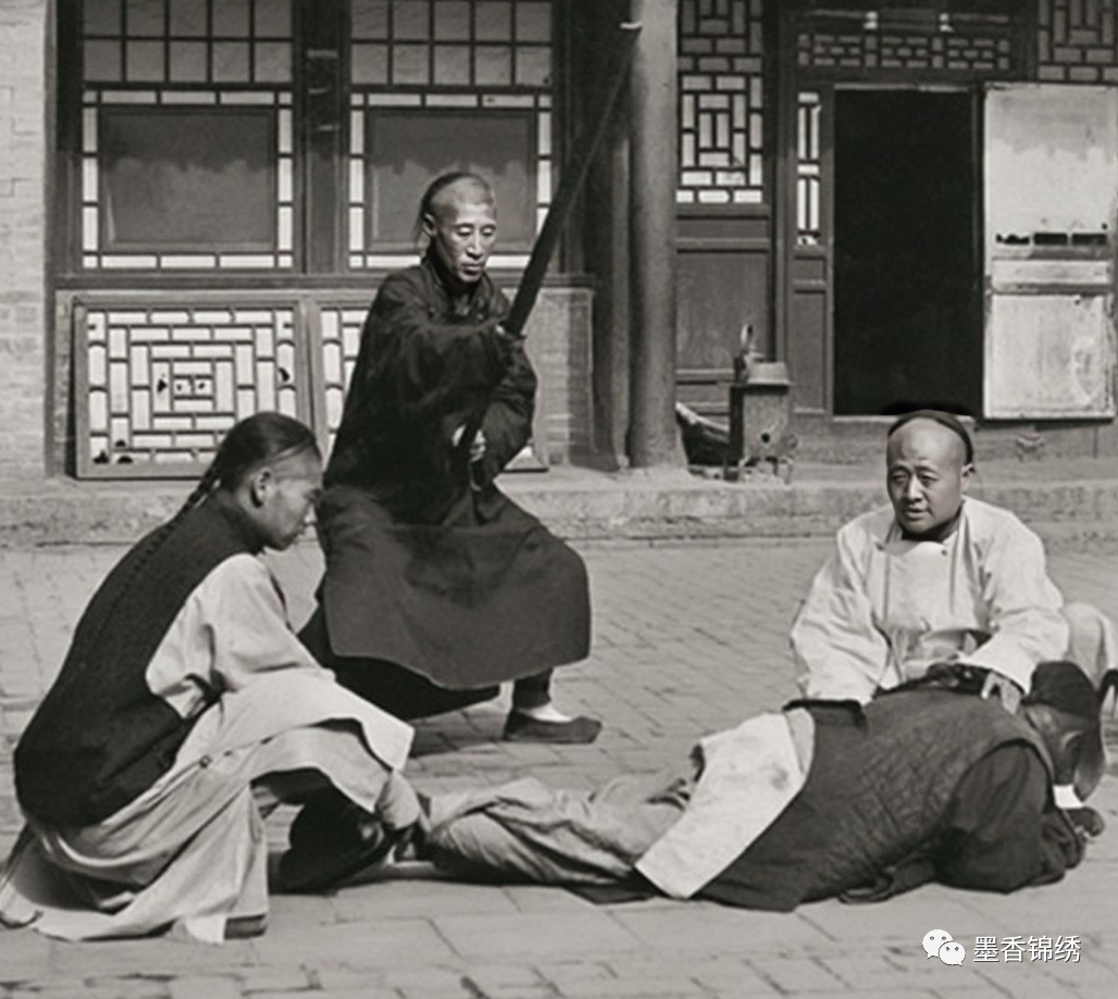 晚清时期的杖责之刑,老照片中的男子因宠妾灭妻而被官府实以杖责之刑。其实这种杖刑比笞刑更为残酷,乃是用厚重的大竹板责打犯事之人。而这种行刑的竹板通常有两斤重,宽为两寸。其杖刑数量为十数一等,通常分为五等,也就是从六十数量到一百下。