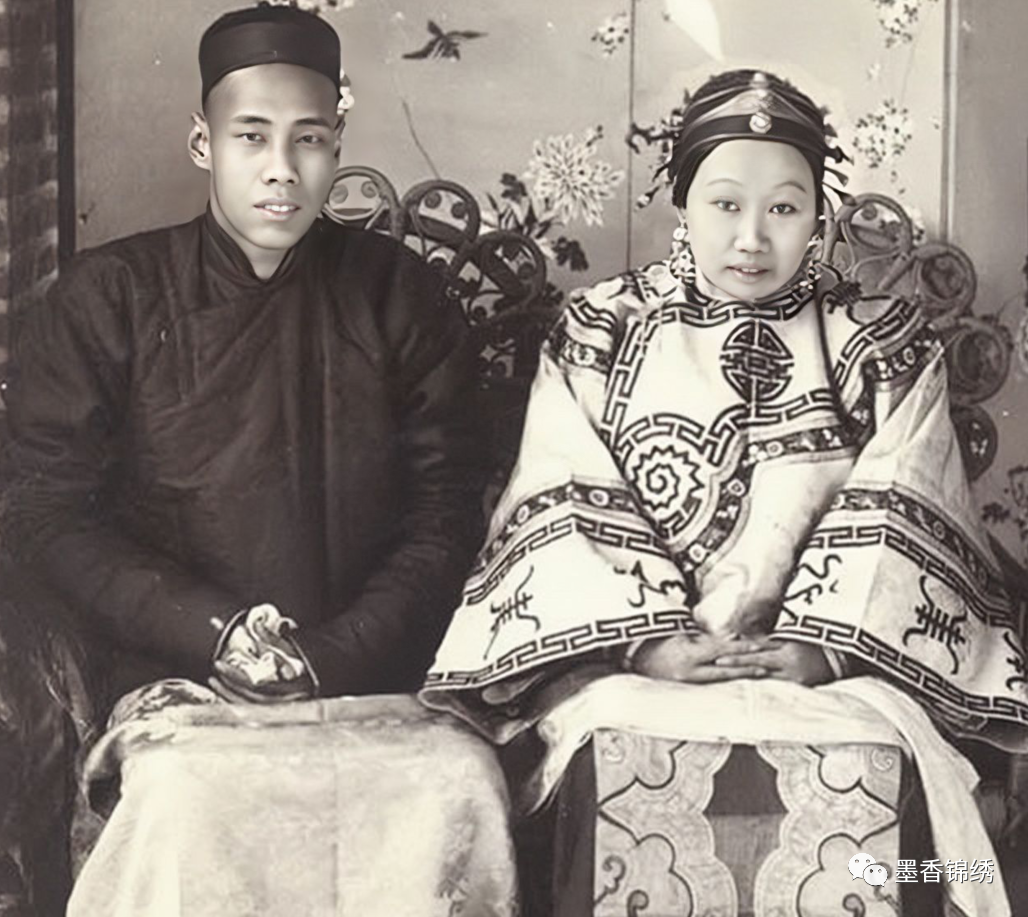晚清1900年的冬季,一位京城里的新婚夫妇的合影旧照。其实古时候女子所佩戴的抹额有着千百年之悠久历史,甚至在很多文物出土中皆有片面记载讲述。后来晚清灭亡,然而其汉族女子佩戴抹额的习惯却一直深有延续,直到二十一世纪时,笔者在诸多乡村之地仍旧看到很多年迈老人佩戴抹额,亦是其身份端正与气质。