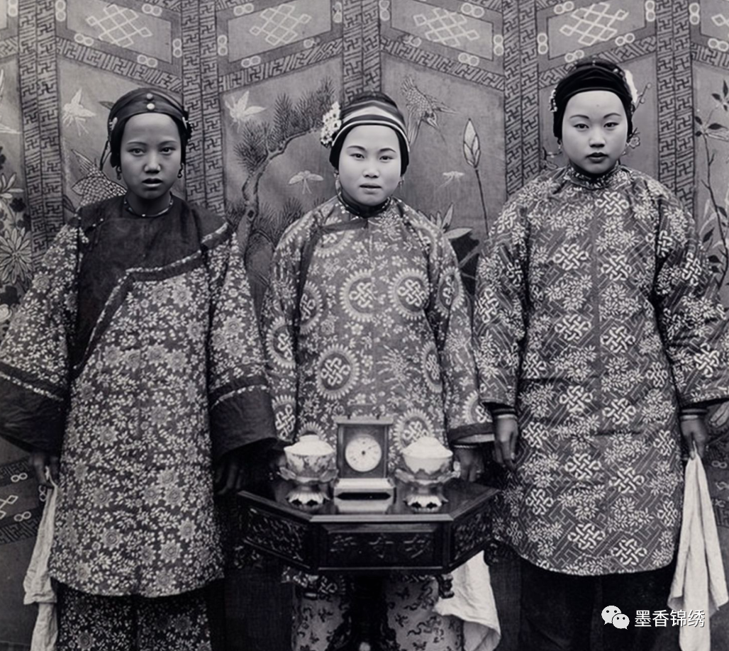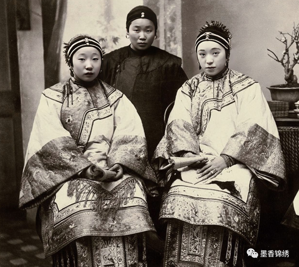 晚清1900年3月时期,三个穿着宽袖裙袄的汉族女子合影老照片。自明朝末年到清朝时期,其民间妇女无论权贵或贫穷,皆有佩戴抹额的风俗习惯。而彼时的女子抹额通常有繁花多种:既有用纱罗裁剪成的条状抹额,亦是有用布条围勒于额前的黑布条等等。