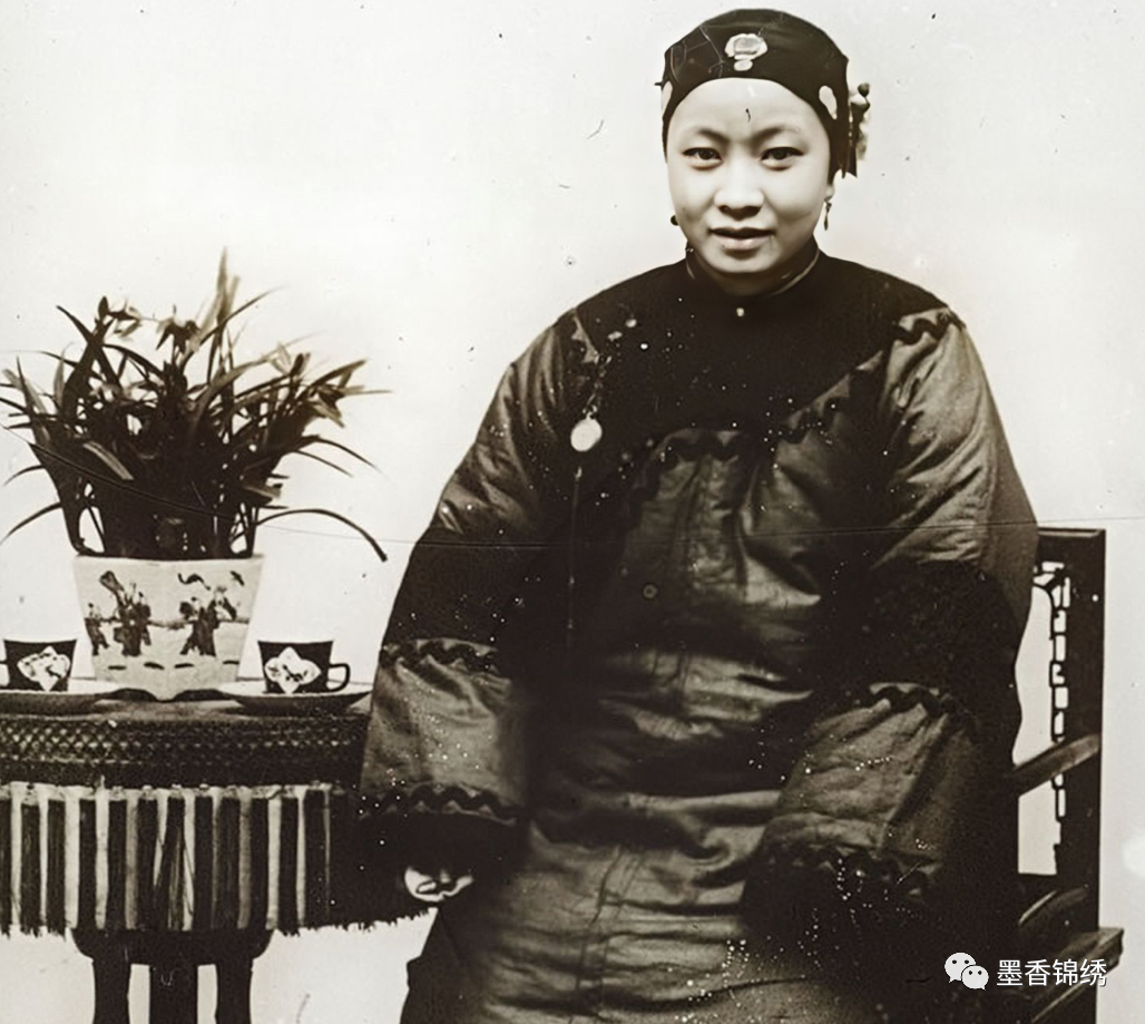 晚清1906年4月,一位家境富裕的上层社会的贵族女子肖像旧照,其实晚清时期的女子抹额千花百种,不同的款式与图案皆是其出身和家境的象征代表。例如若是抹额上绣有牡丹花,便是表示其富贵花开的意思。而若是绣有福、寿等字,则为吉祥喜庆之意。