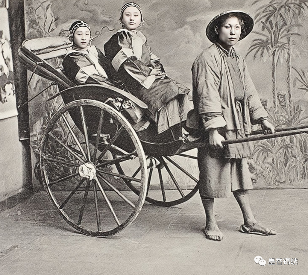 晚清1907年之时,两个戴着抹额的青楼女子坐车出门陪客时留影旧照。其实抹额在汉朝初期就已经出现,当时多以刺绣与珠玉装饰为主。而后来到了明朝与清朝时期,其抹额发饰尤为盛行。而抹额亦是有三大重要作用:一是用来束发:二为装饰象征身份;三则是为女子御寒。