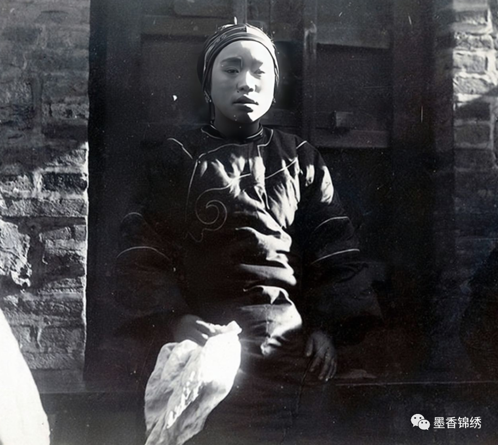 晚清1900年的山东烟台一带的农家妇女。古时候女子们在冬天所佩戴的抹额亦是有所不同,其抹额材质通常以毛皮、绒毛等厚实保暖的为主。而有钱的大户人家女眷还会用珠玉翠石缀满抹额,以示自己的珠光宝气之富贵身份。